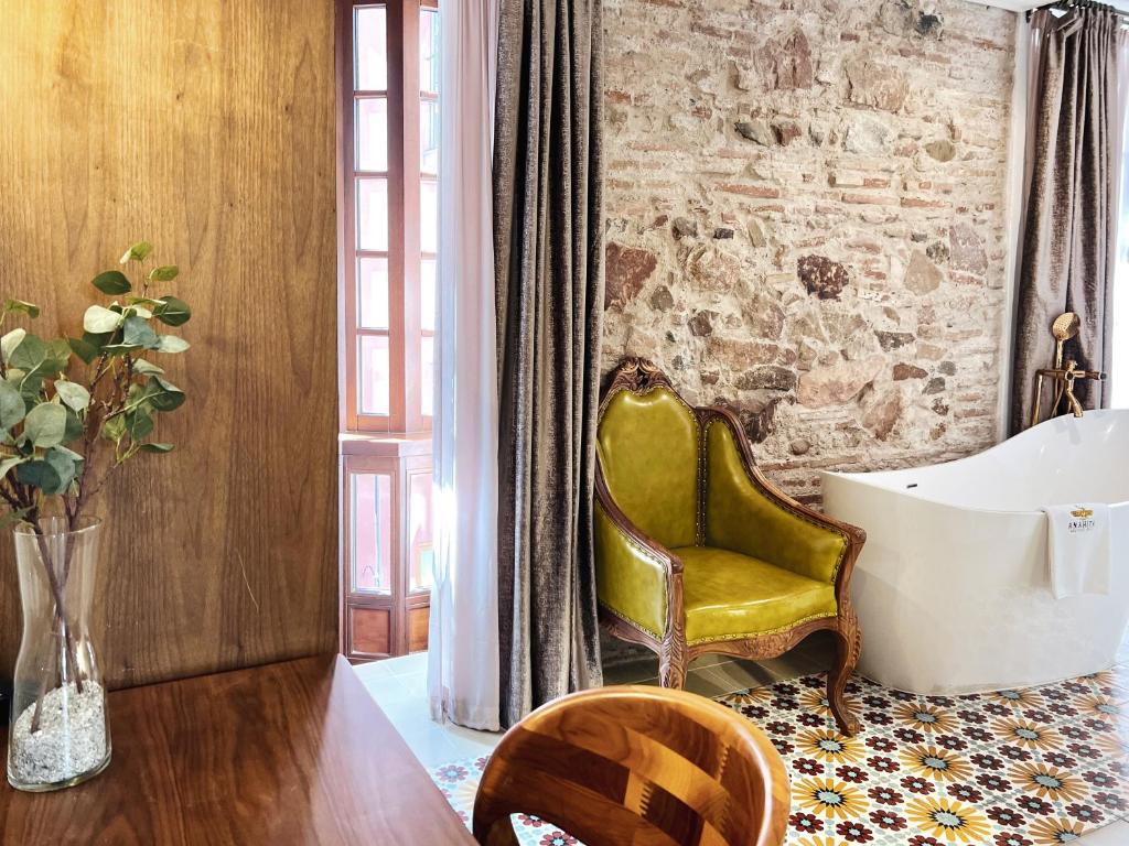Welcome to the Pompeya Suite, our most exclusive two-floor residence inspired by classical grandeur and refined Andalusian design. Located in a restored 19th-century palace, this suite features elegant architectural textures, exposed brick, and carefully restored wall frescoes.