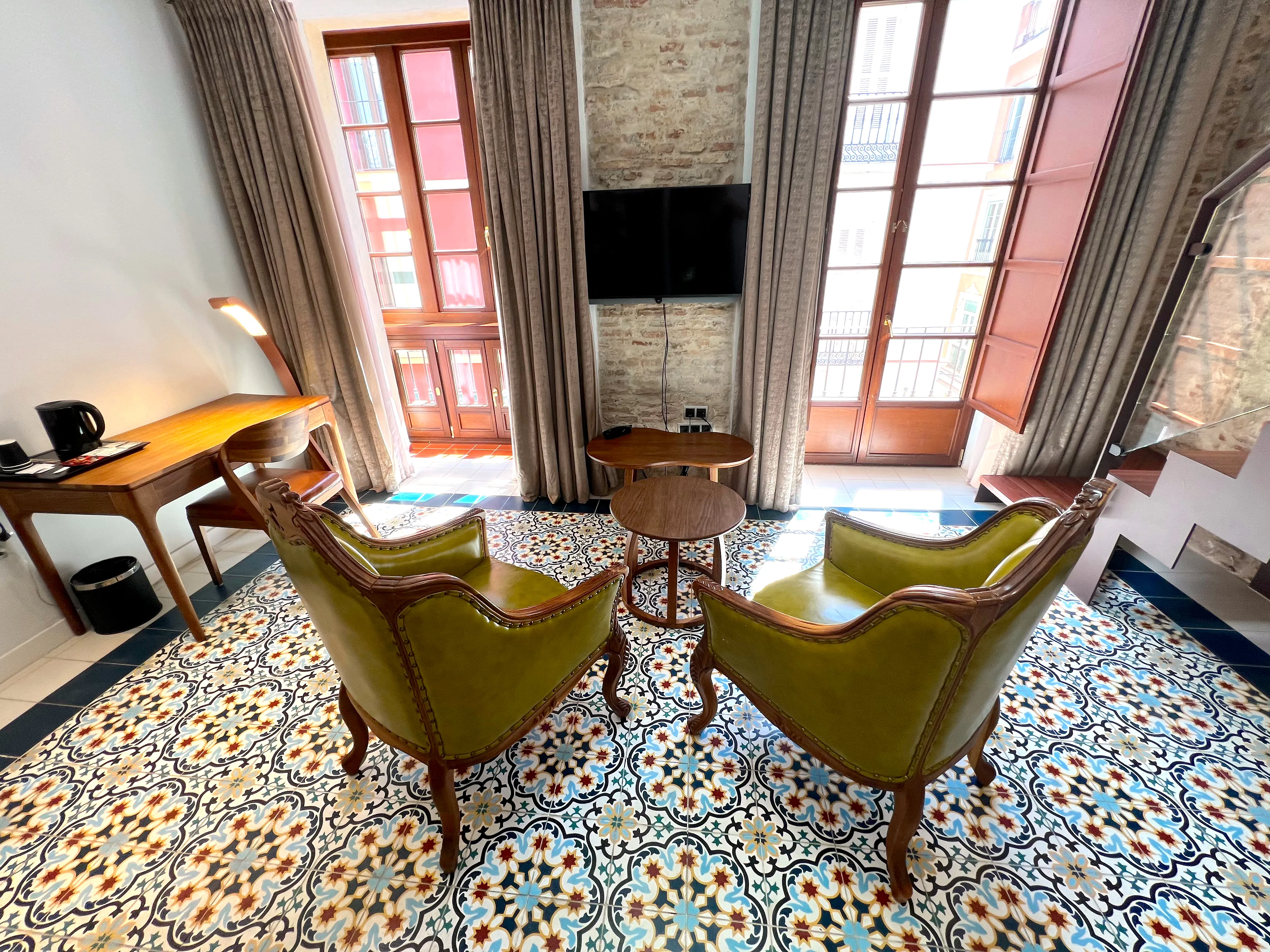Enjoy a king-size bed (2m x 2m) dressed in premium linens, a designer bathroom with a walk-in shower, and handpicked furnishings that blend heritage with modern elegance. Natural light filters through classic wooden shutters, and some rooms offer a balcony with stunning views over Málaga’s historic streets.